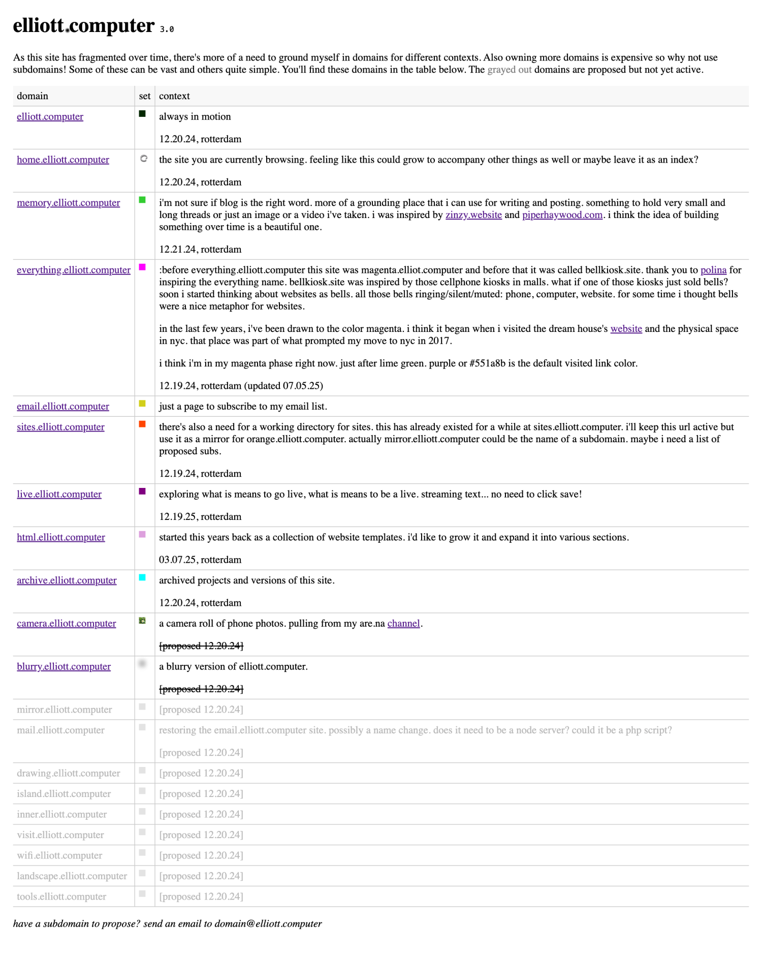 "As this site has fragmented over time, there's more of a need to ground myself in domains for different contexts. Also owning more domains is expensive so why not use subdomains! Some of these can be vast and others quite simple. You'll find these domains in the table below. The grayed out domains are proposed but not yet active."