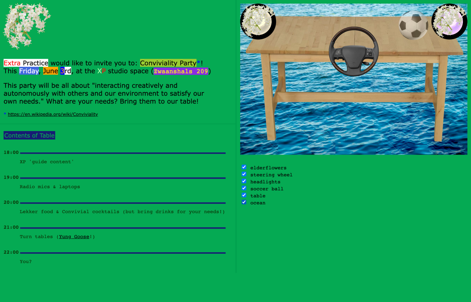 A web invitation for a Conviviality Party at Extra Practice.