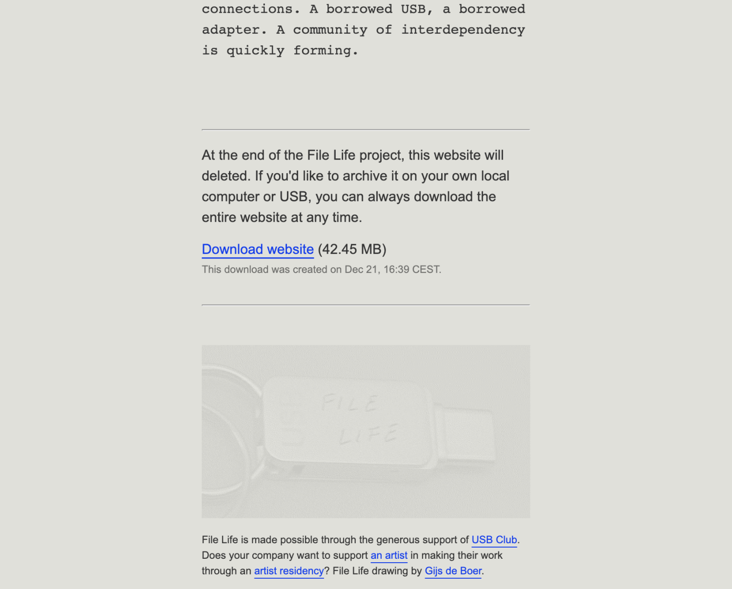 File Life is a touring project and travel blog about letting go of files. As I travel, I collect files that people want to let go of. I ask each participant to delete the file they've given me, so that the only remaining copy exists on a USB I carry. In return, I take their files on a tour of the mountains and the oceans. When the USB fills up, I will delete the files. You could think of the website as a memorial to files. The file life website's original url was filelife.tours (which no longer exists). It is now hosted at here. File Life was supported by USB Club.