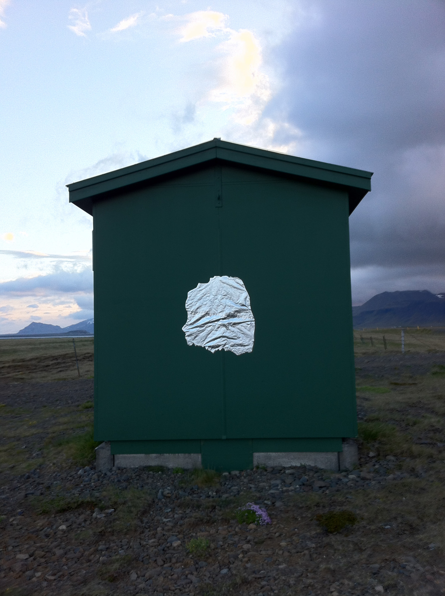 In 2013, I traveled to Iceland with a painting class and during my daily walks, I passed by a green utility shed. Even from the farm where I was staying, I could still see the shed in the distance, but it appeared as a mere dot on the horizon. I created a foil piece to temporarily adhere to the shed, and later removed it a year later. The tape marks left behind a constellation of dots.
