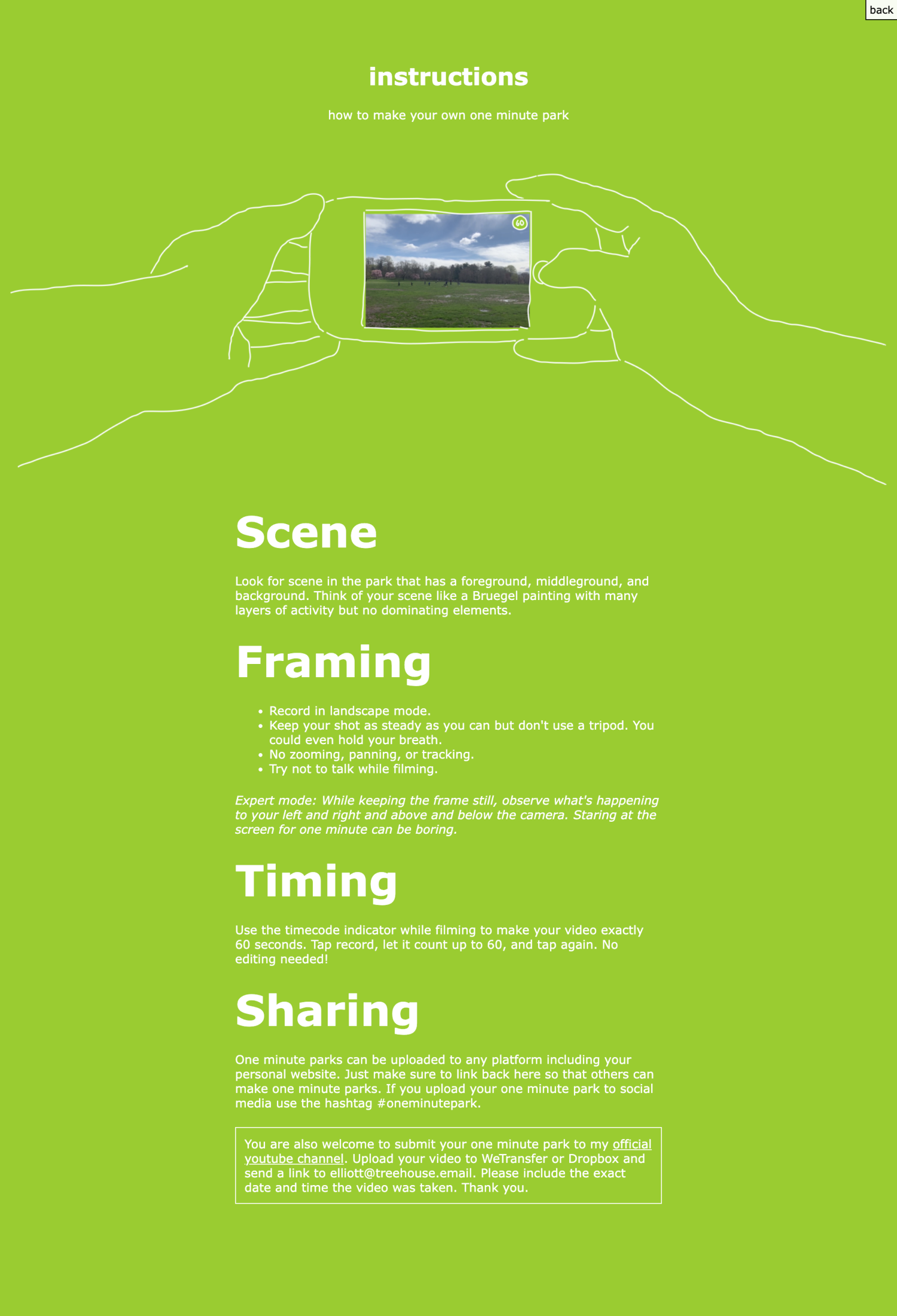 A practice of taking 1 minute still videos in parks.