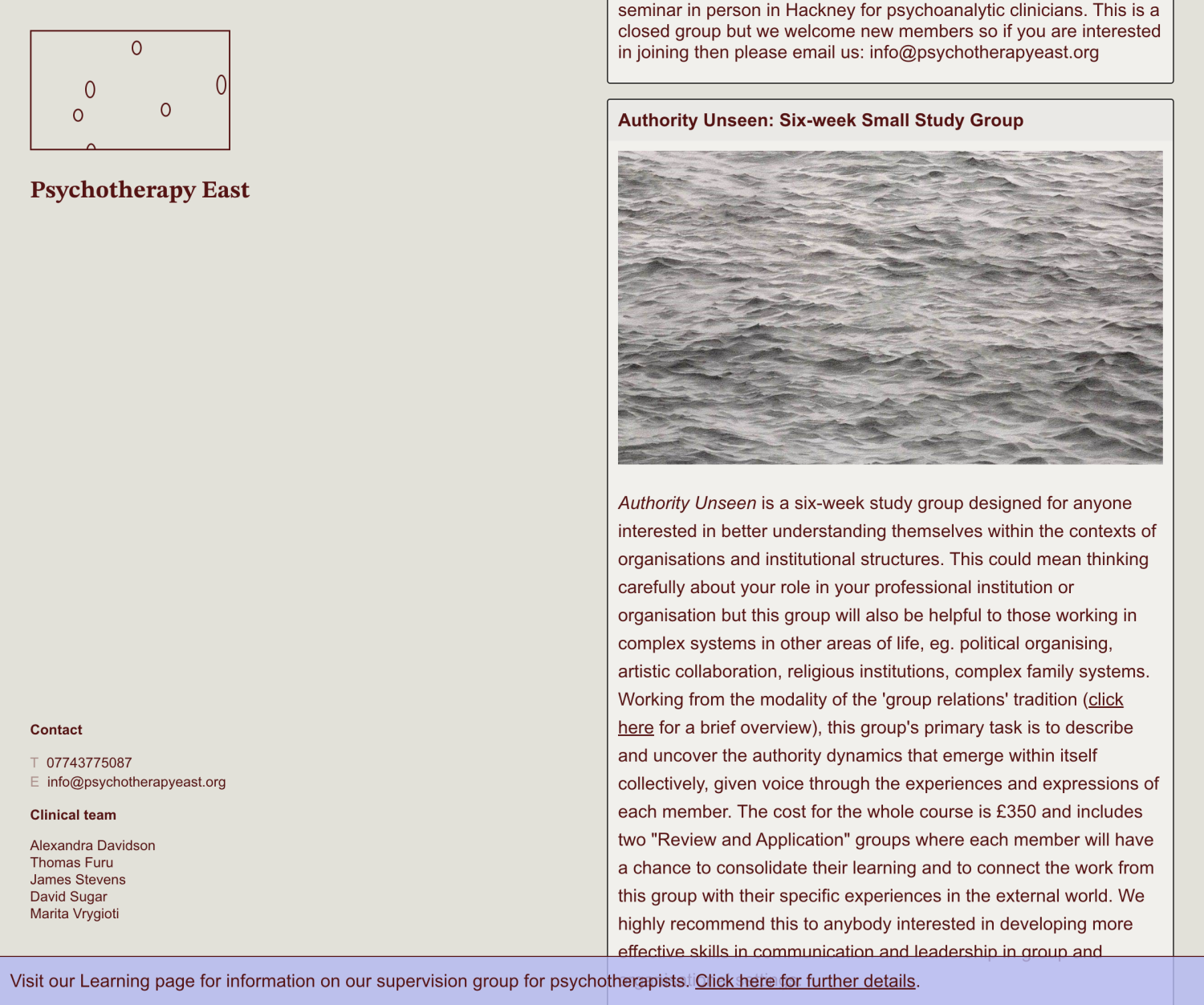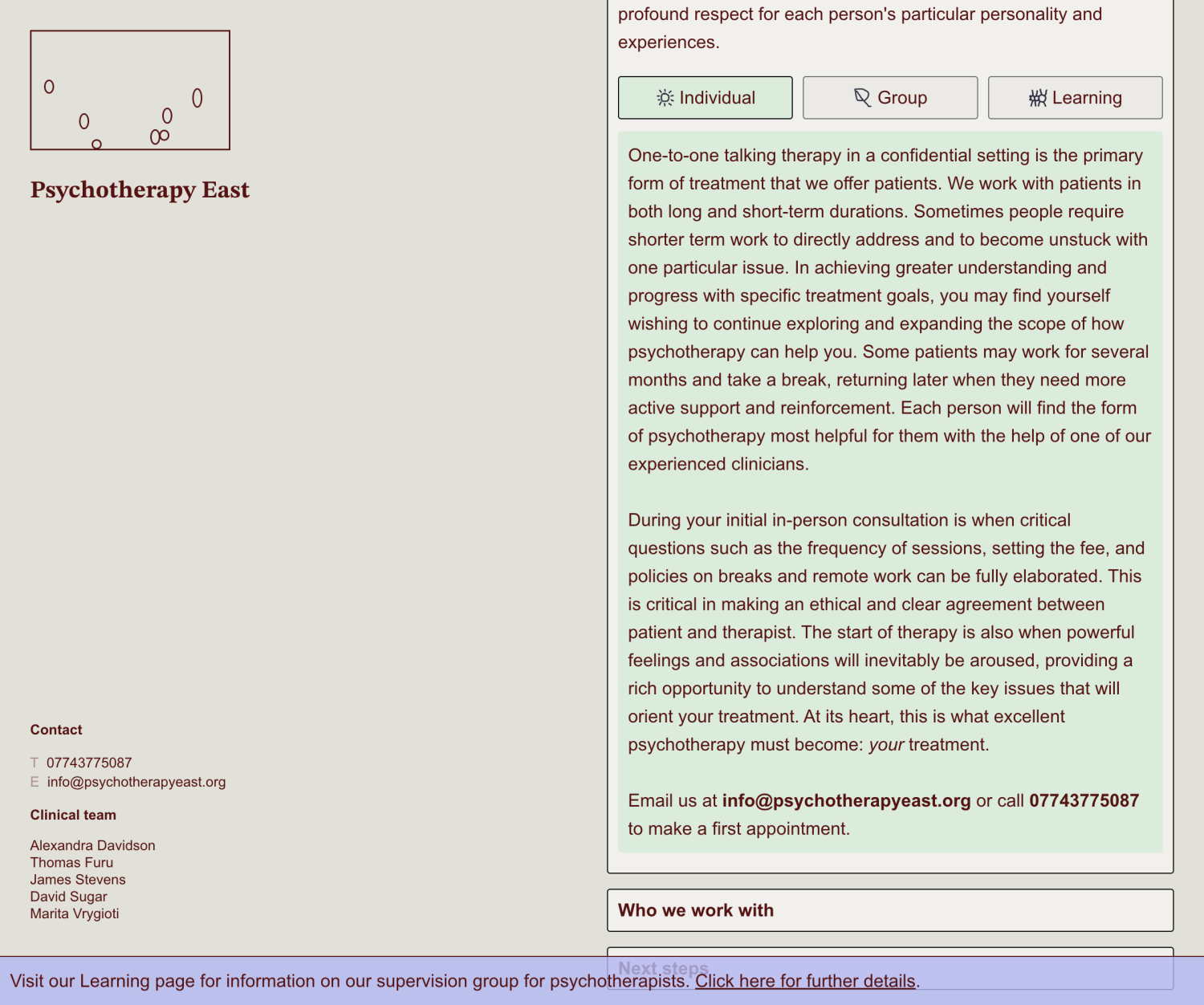 Psychotherapy East is a group of psychotherapists based in East London with a mission to offer high quality in-depth psychotherapy for individuals and groups. The site was designed to be direct and accessible with expandable sections for more information.