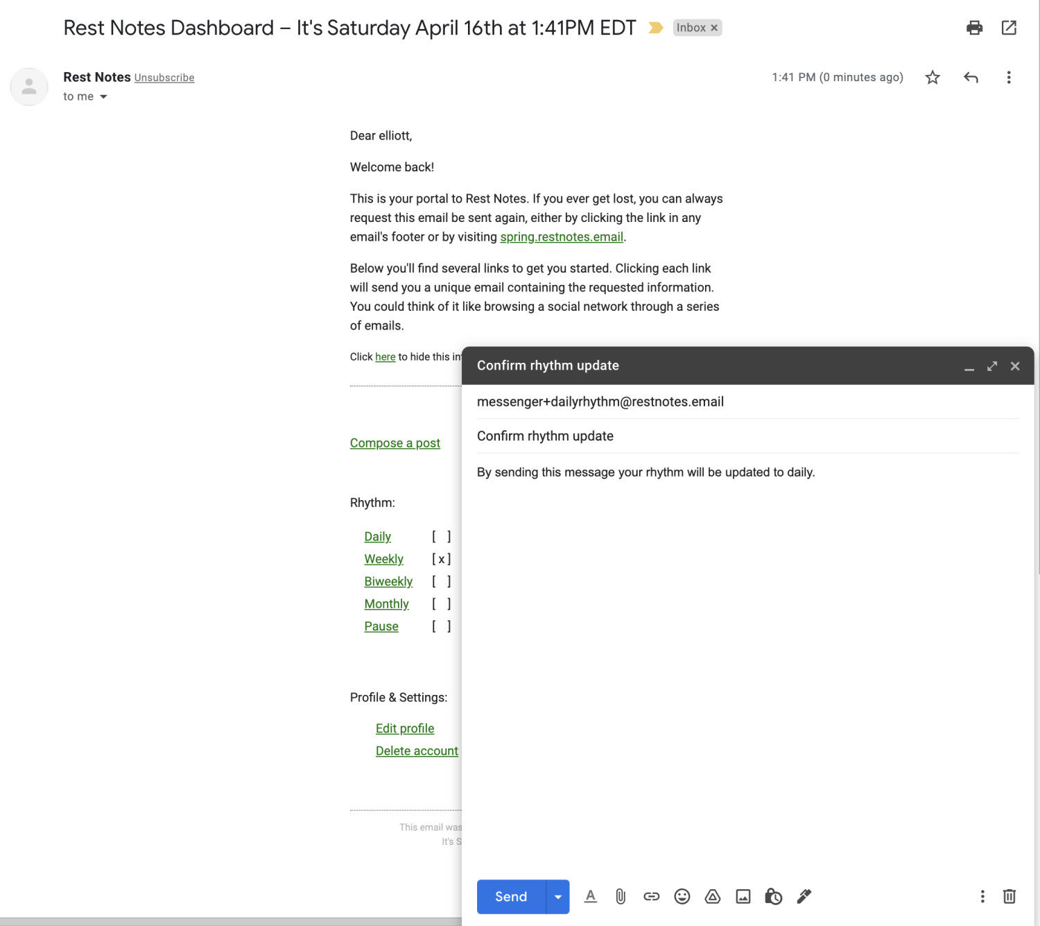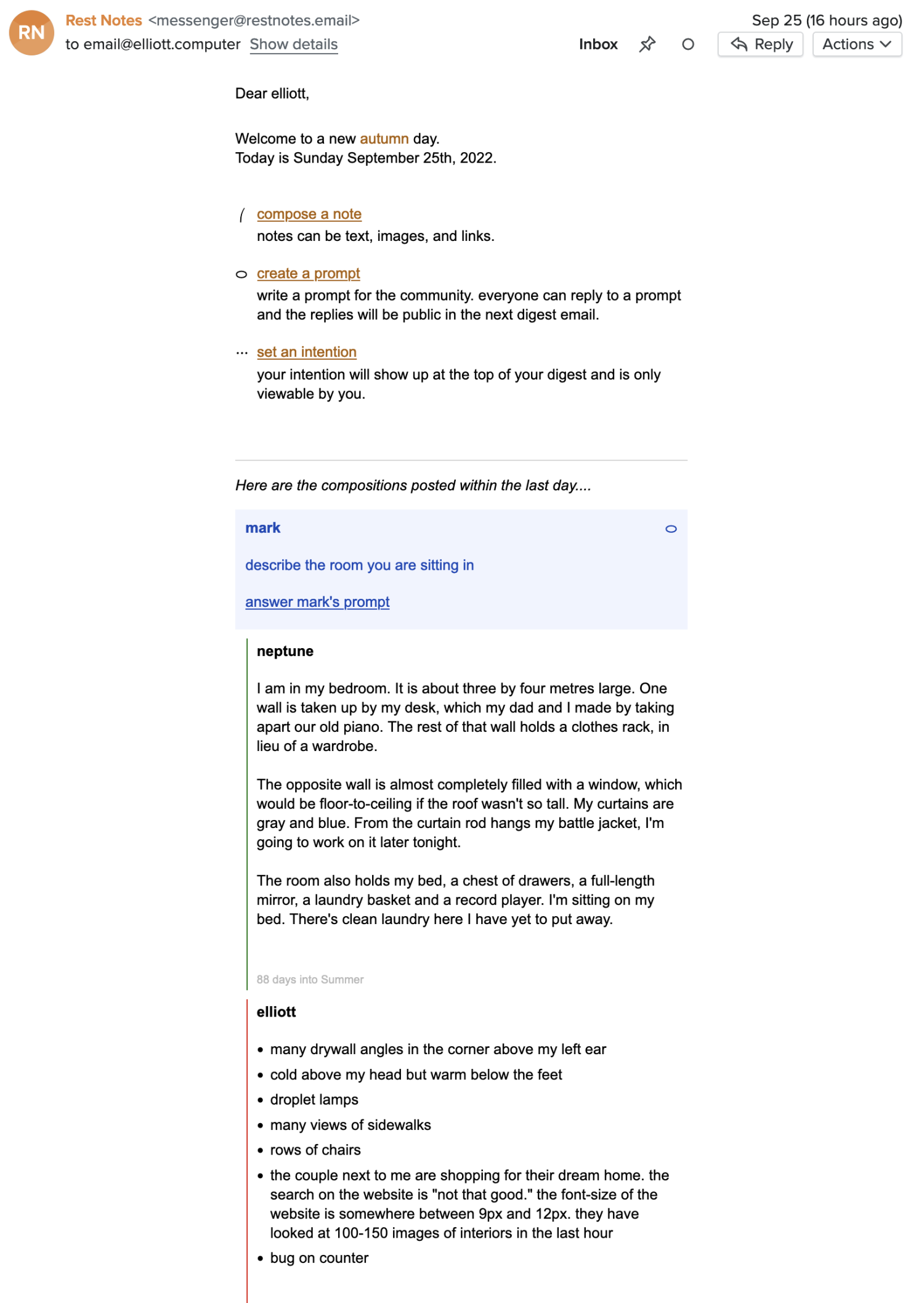 Rest Notes is a community email network with rhythm. This project is a collaboration with Mark Beasley.