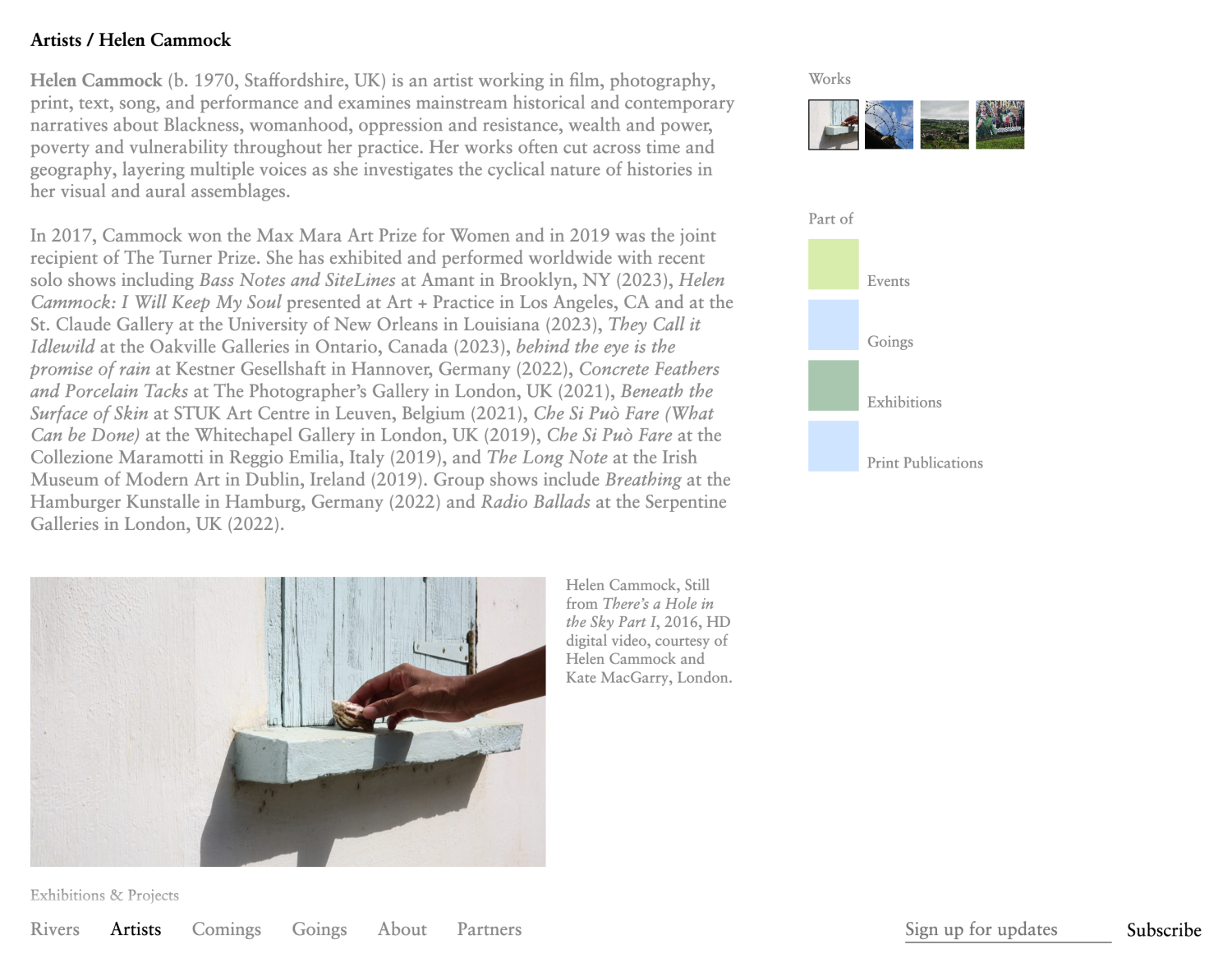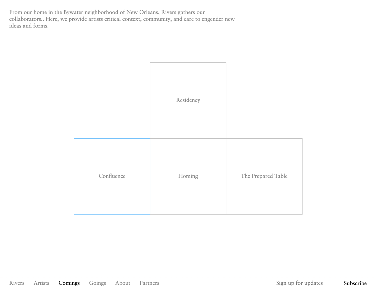 In the Winter/Spring of 2025, I worked with the Rivers Institute on a design update and restructuring of various aspects of their website. I designed a new block layout inspired by the daily color block homepage that changes each day, simplified the homepage, added artist pages, and created Comings & Goings sections.