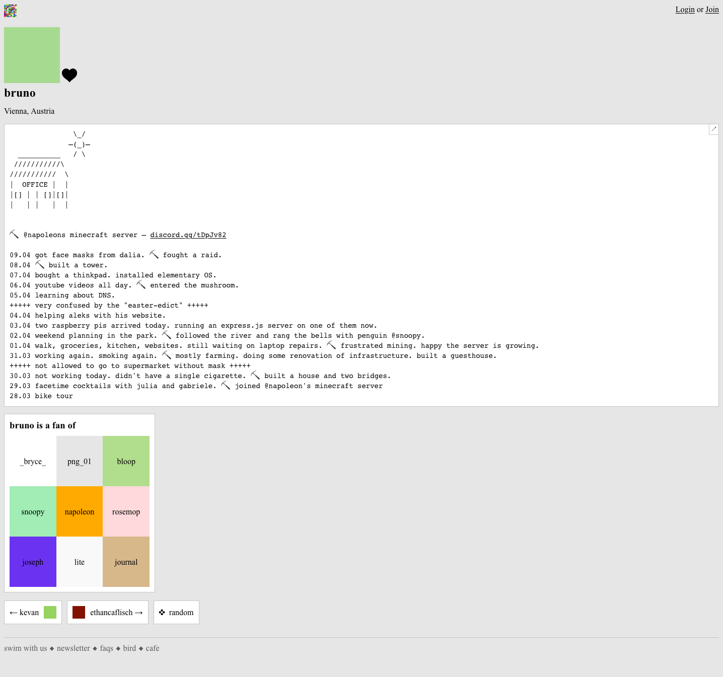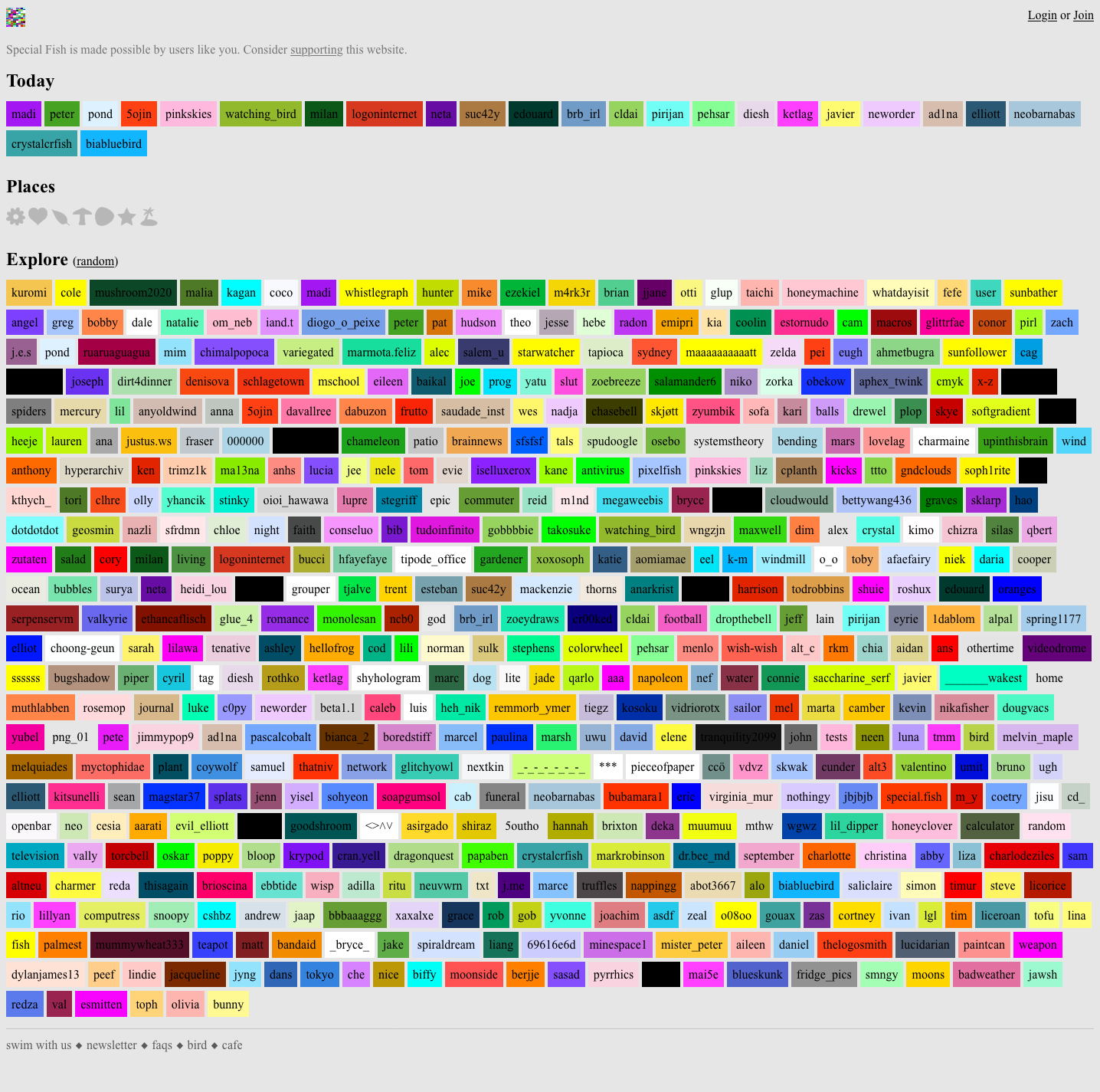 Special Fish is a directory of profiles. Each profile is composed of a text-based log, lists, and links.