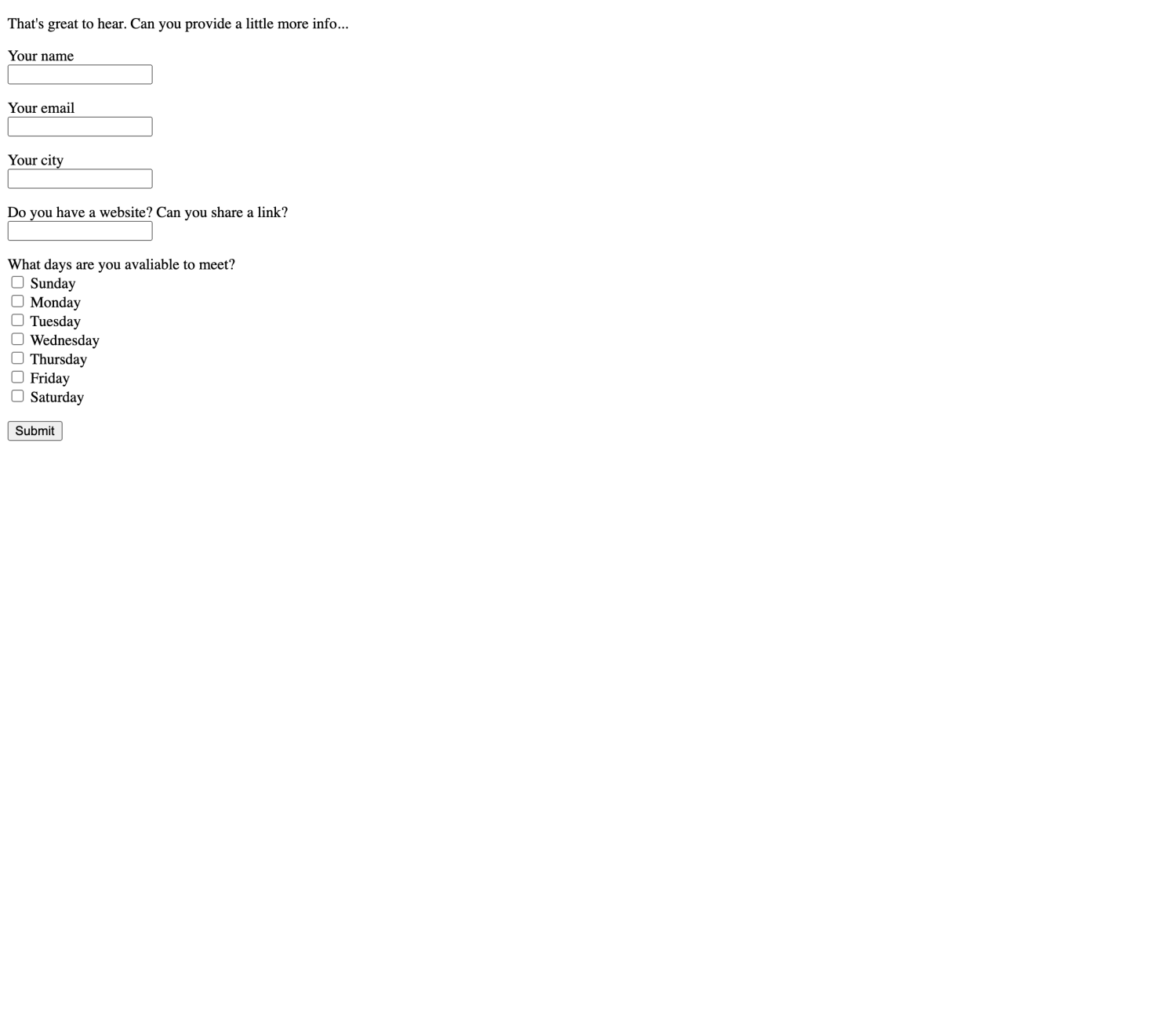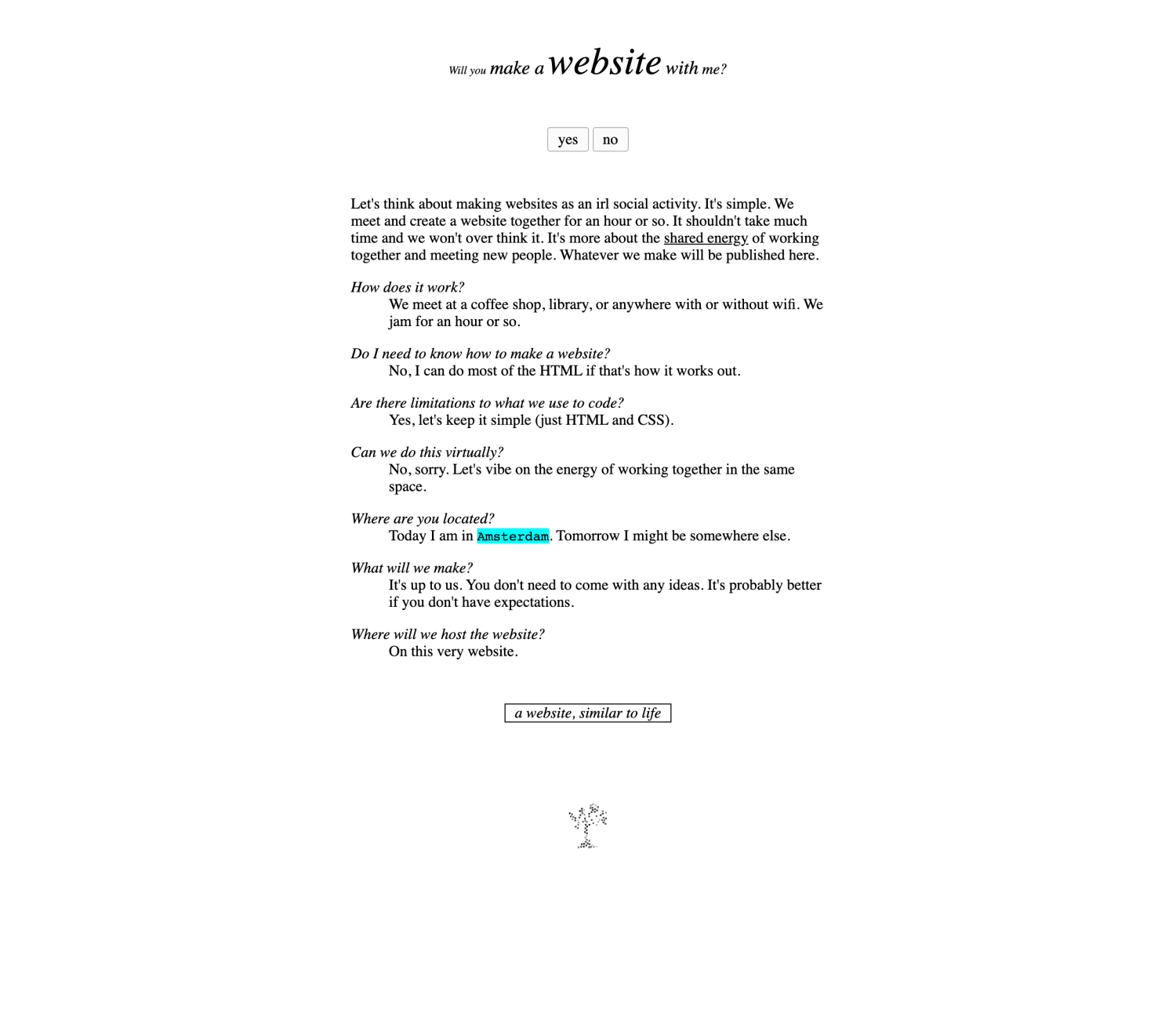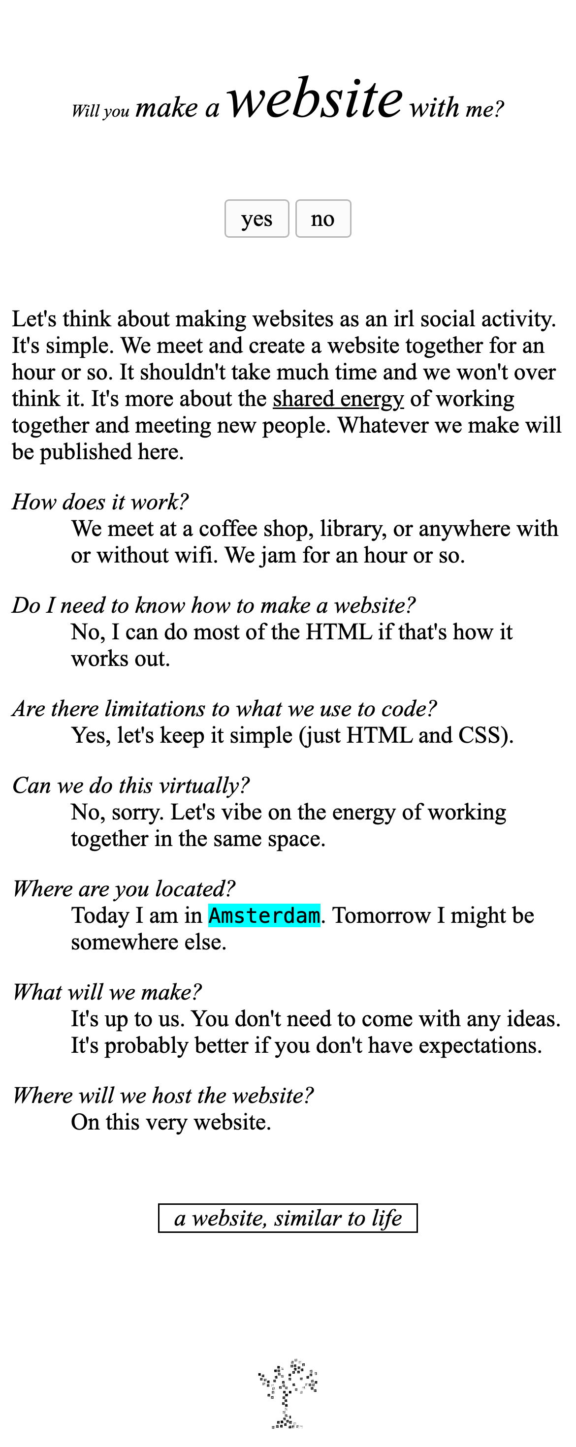 Let's think about making websites as an irl social activity. It's simple. We meet and create a website together for an hour or so. It shouldn't take much time and we won't over think it. It's more about the shared energy of working together and meeting new people. Whatever we make will be published here.